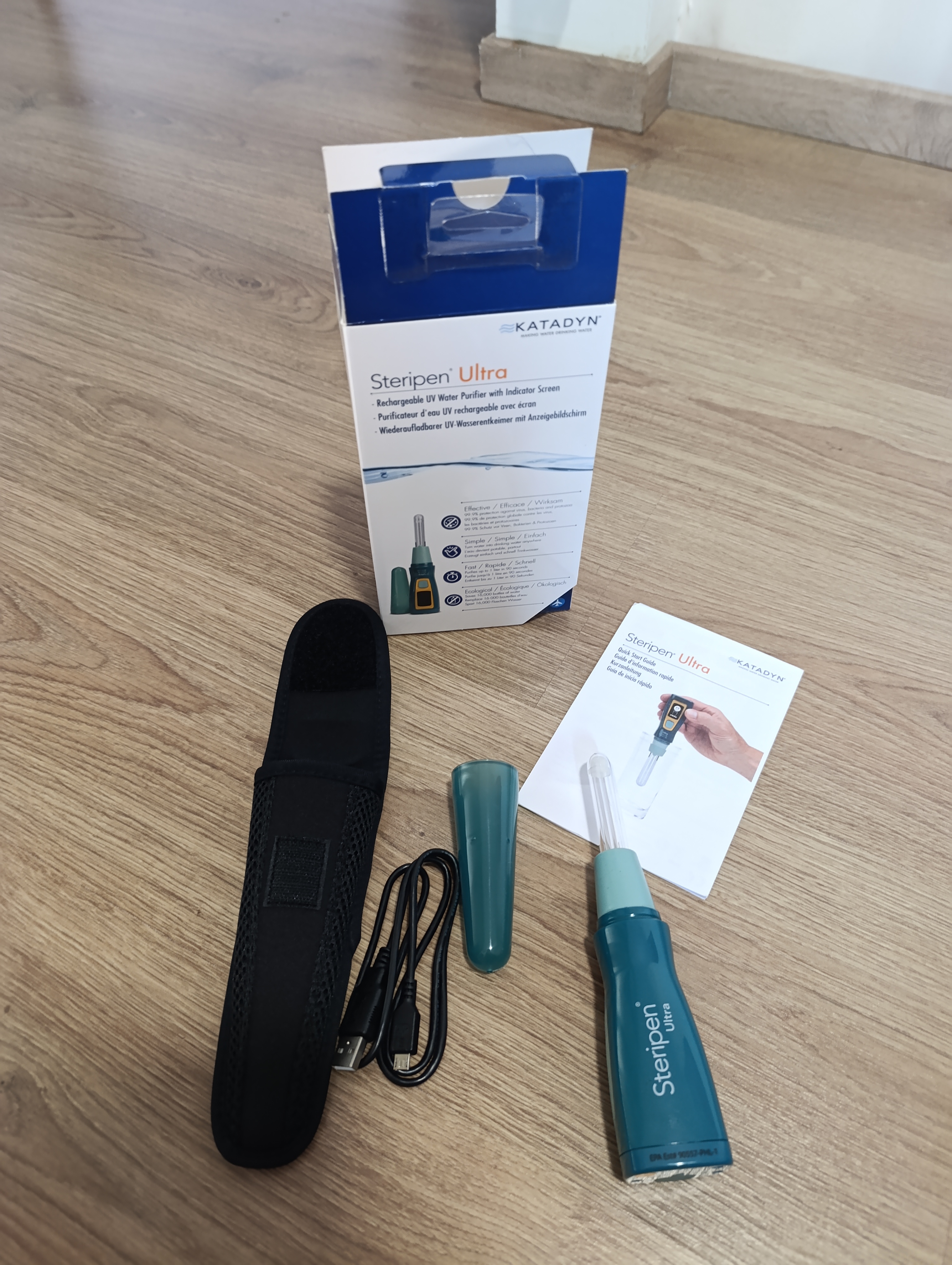 Il existe différents modèles, mais j’ai choisi le SteriPen Ultra pour plusieurs raisons : il permet de stériliser au choix 50cl ou 1L en 48 à 90 secondes ; il est à batterie et non à pile (puisque je vais dormir dans des homestays et non en bivouac, je pourrai le charger sans problème), la taille est adaptée à des goulots plus fins que le SteriPen Ultra Light, et il tient deux fois plus longtemps entre deux charges… tout ça pour un poids de 140 grammes et un prix de 120 euros. S’il tient ses promesses, il m’évitera d’acheter des bouteilles durant tout mon voyage et sera donc rentabilisé, économiquement et écologiquement !