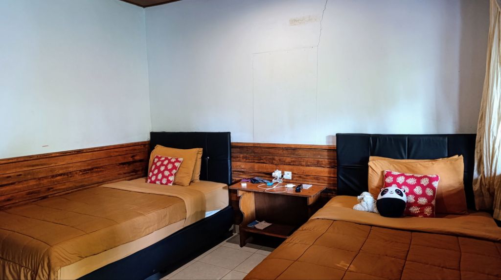 Pour ce prix, nous avons une petite terrasse donnant sur le jardin, où nous est servi le petit déjeuner, un ventilateur, 2 grands lits simples, et le ménage est fait quotidiennement.