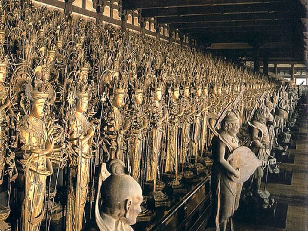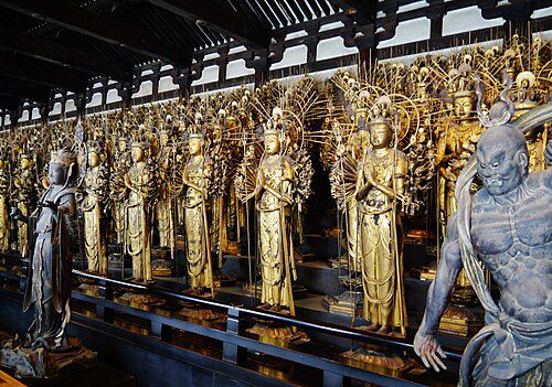 Quelle merveille en pénétrant dans le long bâtiment en bois principal ! Nous découvrons pas moins de 1001 statues de la déesse Kannon, devant lesquelles se trouvent les statues de 28 autres divinités protectrices.