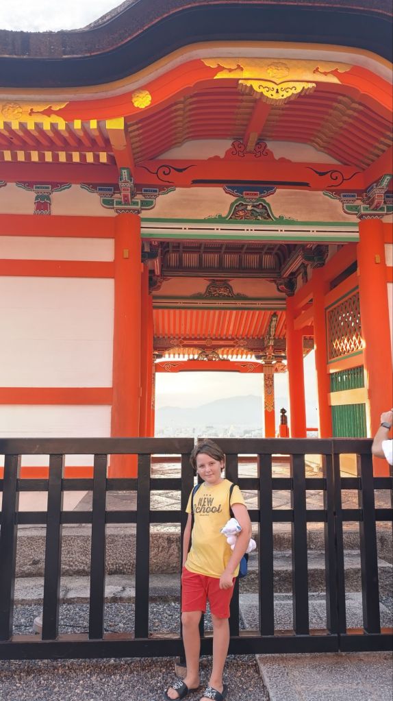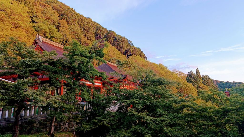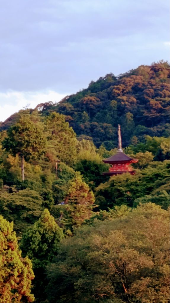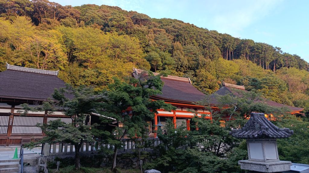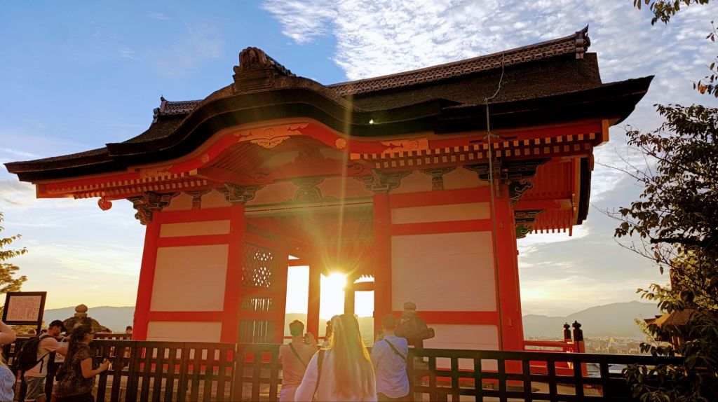 Après cette première visite, nous nous sommes rendus au pas de course, vu l’heure tardive, vers le temple Kiyomisu-dera. Il s’agit d’un immense complexe en lisière de la ville, à flanc de colline, dans une splendide forêt. Ce temple bouddhiste a été bâti au 8 ème siècle et reconstruit après un incendie. Nous sommes arrivés peu avant le coucher du soleil, et avons été surpris de trouver tant de monde à si peu de temps de la fermeture. Mais après avoir fini de grimper vers le temple principal, nous avons compris l’engouement à cette heure. Le site offre un panorama merveilleux sur le soleil qui se couche sur Kyoto.