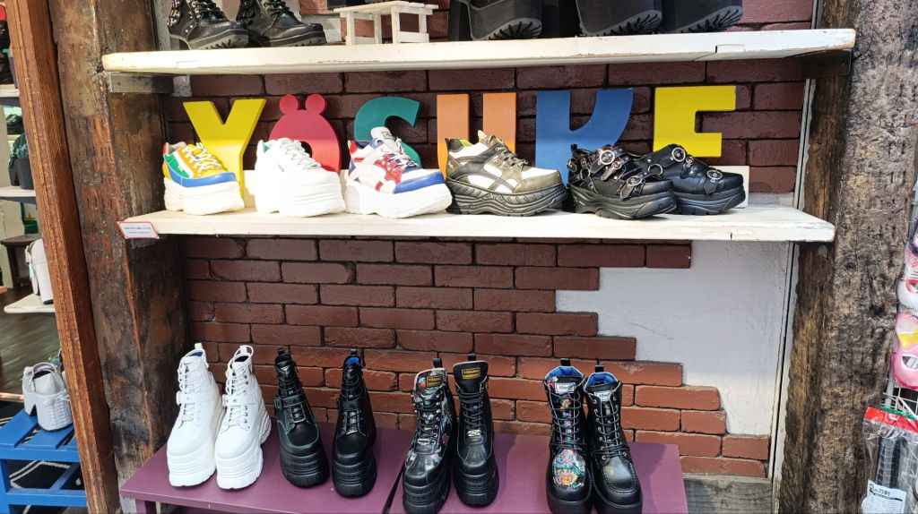La rue kawaii: dans cette rue, il y a beaucoup de boutiques kawaii (mignon) et de mangas. Il y a aussi pas mal de gothiques, ou des personnes qui sont habillées en manga. Ils s’habillent beaucoup dans ce style avec des colorations de cheveux, des lentilles pour les yeux, beaucoup de percings et de tenues noires, avec des grosses chaussures.