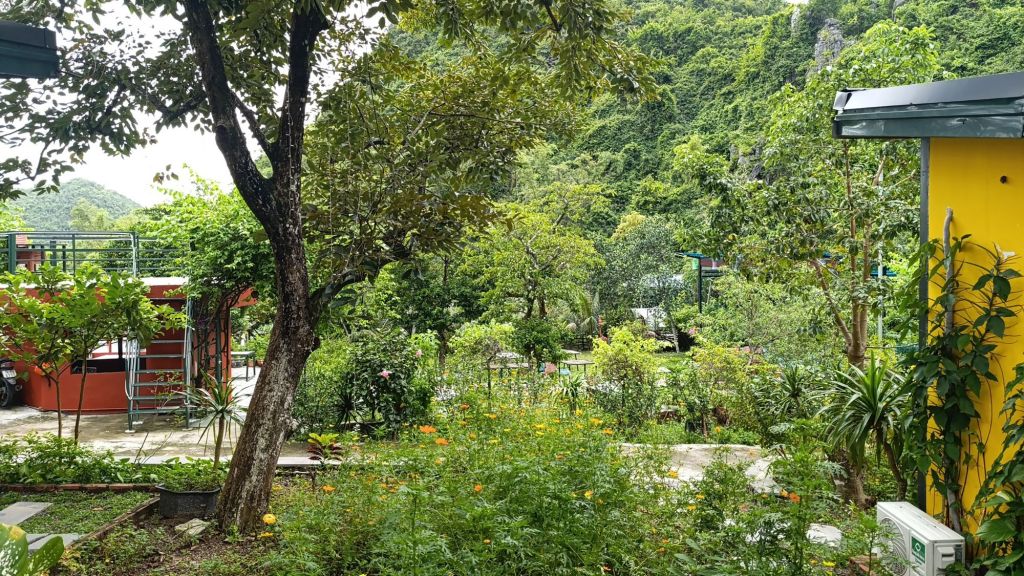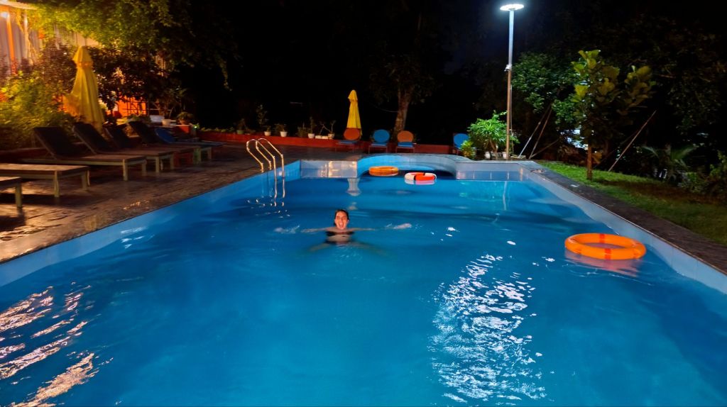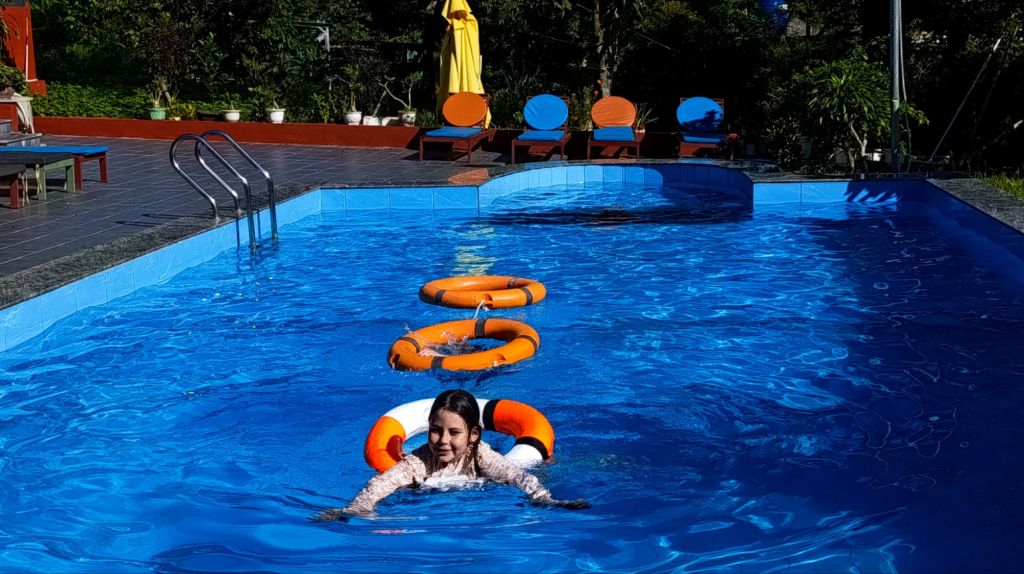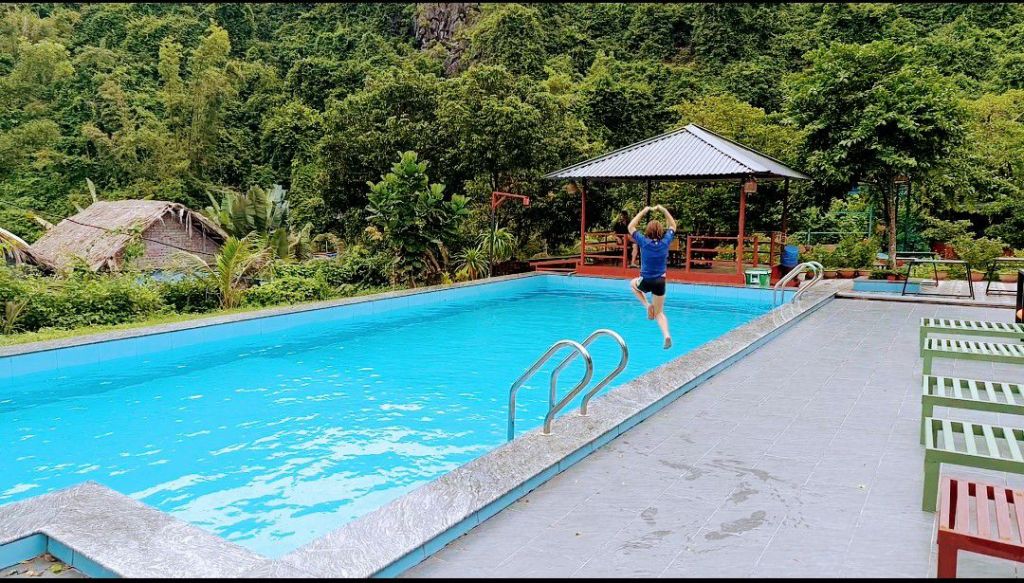 Notre hôtel se situe dans un petit havre de paix et de verdure…et dispose d’un élément au combien apprécié de Maël: une piscine 😊