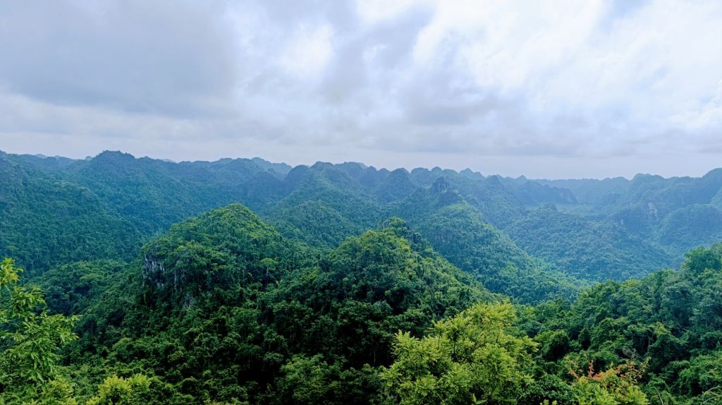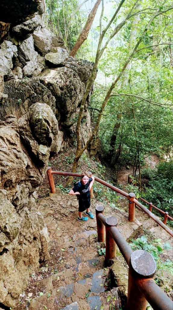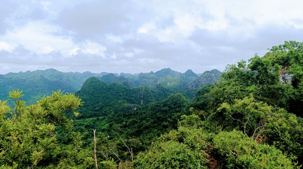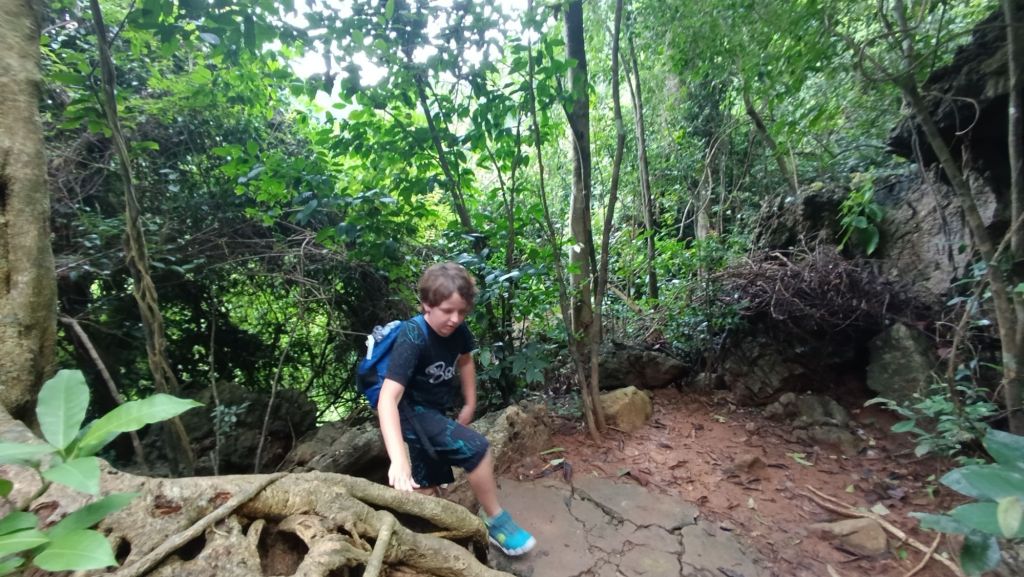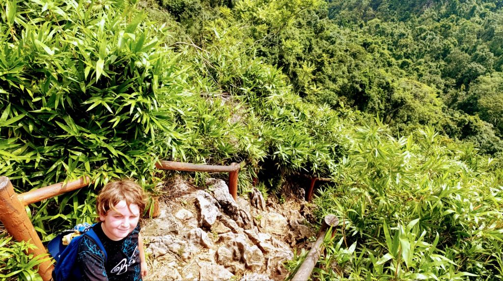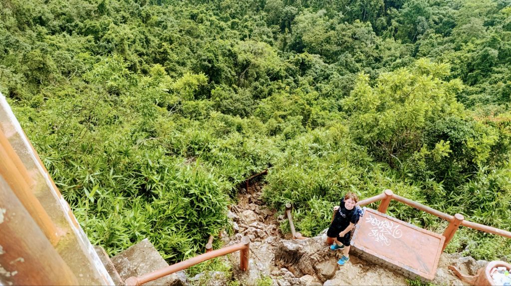 Pour notre première journée complète à Cat Ba, heureuse de me retrouver dans un environnement naturel, nous avons décidé de partir à la découverte du parc national. Une petite randonnée de qui grimpe en pleine chaleur humide, pour arriver, au sommet, à un point de vue grandiose. J’étais au paradis en chaussant pour la première fois depuis longtemps ma tenue de randonnée. Maël l’était un peu moins avec les hautes marches et la chaleur 😜