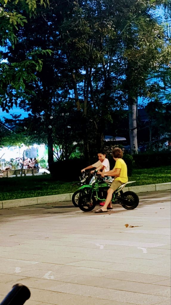 J’apprécie cette promenade en solitaire, au cours de laquelle je découvre tout à la fois une vie qui semble s’écouler avec joie et sérénité, des habitants souriants et avenants…et une immense place centrale occupée par une aire de jeu et une piste de mini véhicules électriques, entourée de bancs, de vendeurs ambulants, restaurants et bars. Et au milieu de tout cela, pas l’ombre d’un touriste. Le coup de cœur ressenti dans la guest house se poursuit 😄