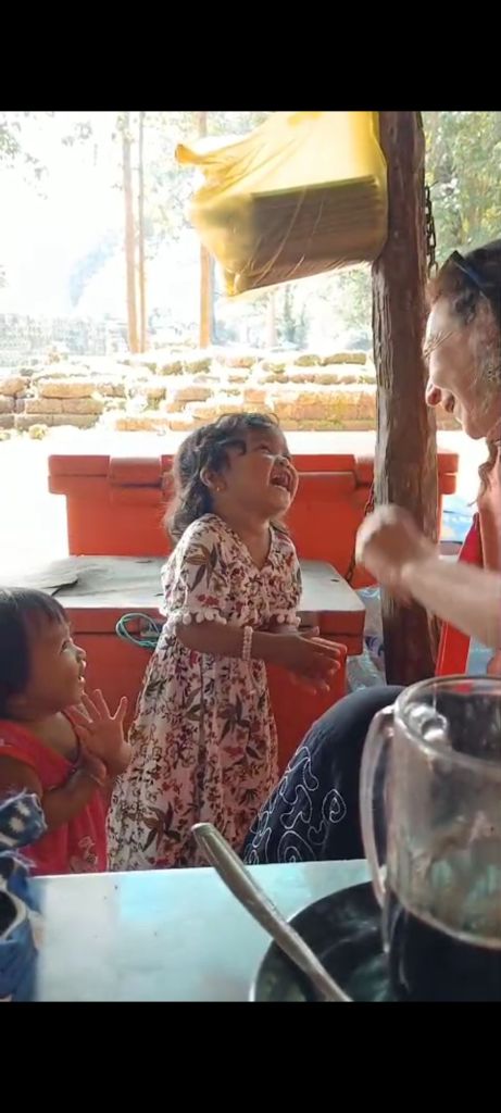 Aujourd’hui, lors de nos visites des temples, nous nous sommes arrêtés boire un café dans une échoppe. Se trouvaient là les 2 petites filles de l’une des femmes y travaillant. Nous avons passé un moment incroyable avec ces 2 petites filles pleines de vie, avec qui nous avons joué et que nous avons beaucoup fait rire. Un vrai moment de bonheur et de partage, de ceux que l’on oublie pas. Les petites, qui vivent visiblement dans des conditions très rudes, et ne possèdent pas grand chose, ont eu un vrai coup de cœur pour les Labubus de Maël accrochées à son sac à dos.