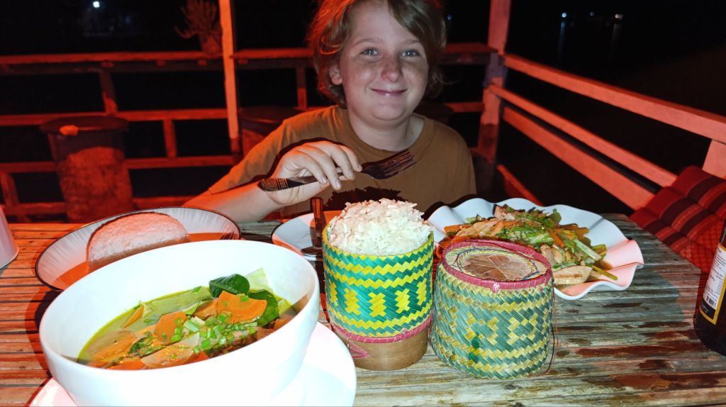 Nous voilà donc arrivés à la Souksanh guest house, et nous trouvons un nouveau petit paradis, sur l’île de Don Khone. Quiétude, calme absolu, tranquillité… Tout ce dont j’avais besoin ! Nous sommes en plus seuls ce soir dans la guest house, ce qui n’est clairement pas pour me déplaire (oui oui….je sais…. Un travailleur social qui ne supporte parfois pas les gens, c’est contradictoire, ne cherchez pas à comprendre !) L’endroit est adorable: bungalow avec terrasse et hamac au bord du Mékong, petit restaurant avec matelas et coussins, bercé par le bruit du fleuve ,tout cela pour un prix encore dérisoire. Je me sens bien, sereine et apaisée, et compte bien profiter de ce nouveau petit paradis 🙂