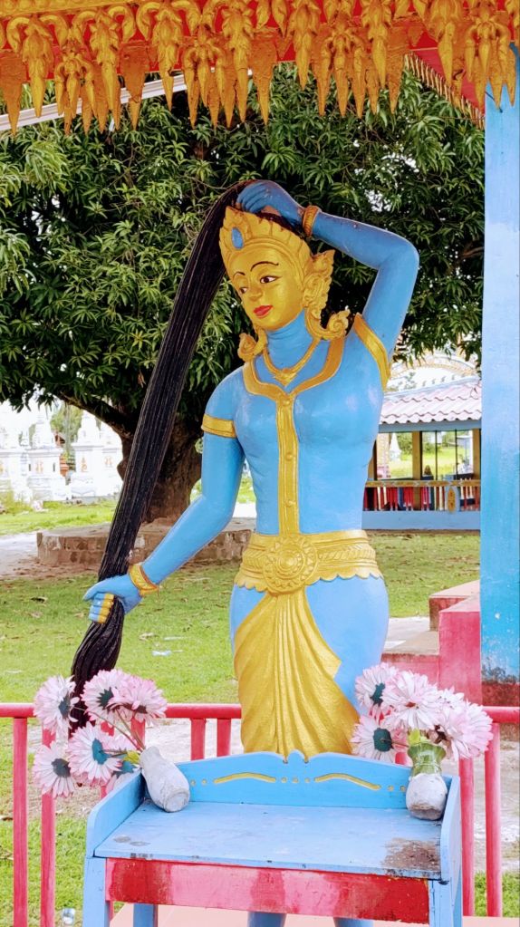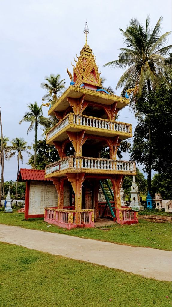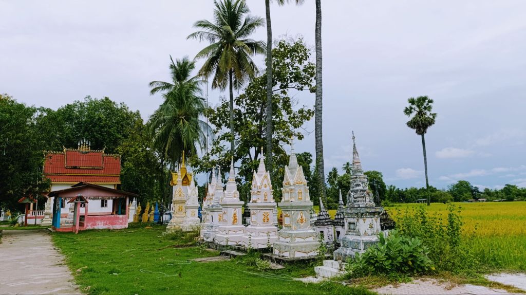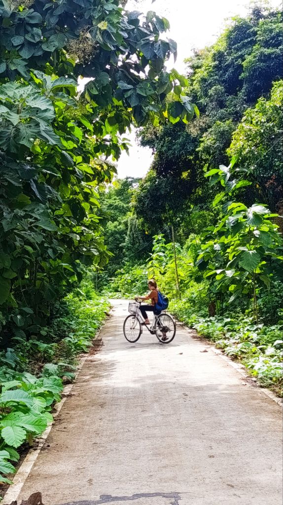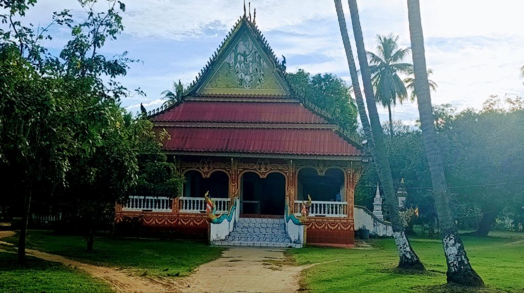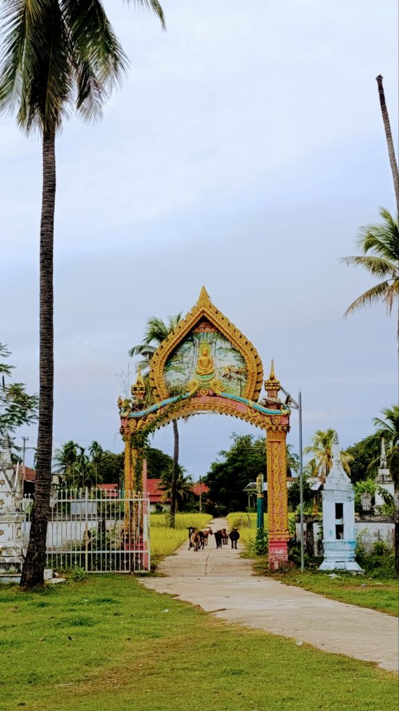 Nos journées s’écoulent paisiblement. Nous prenons des vélos, et nous contentons de pédaler, tranquillement, sur une île, sur l’autre; tantôt au bord du Mékong, tantôt au milieu de la forêt ou des rizières. Outre de beaux paysages ou des moments de vie locale, nous découvrons tout de même quelques temples paisibles, qui nous donnent une fois de plus l’occasion de remercier la vie pour ce beau voyage que nous faisons.