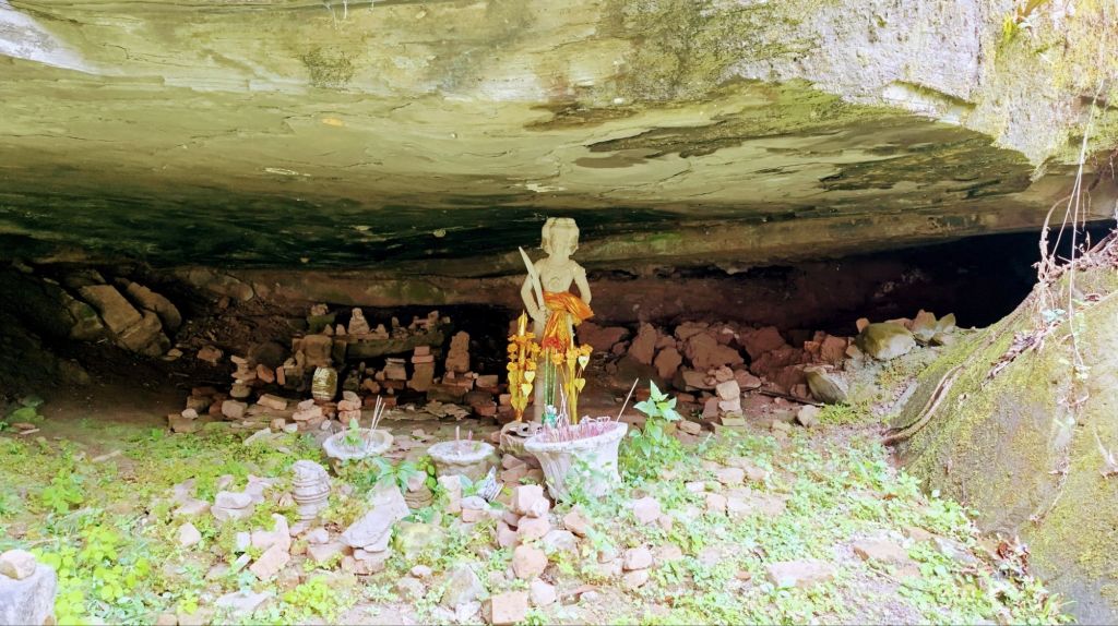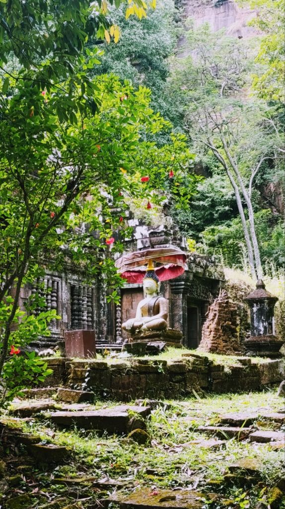 Hier matin, nous voilà prêts à enfourcher nos bicyclettes, pour 12km sous la chaleur, afin de nous rendre au temple « Wat Phu », merveilleux vestige d’un temple d’architecture Khmère du 11e siècle, qui n’a pas grand chose à envier à ceux de la région d’Angkor. Le site est absolument magnifique, et est classé au patrimoine mondial de l’Unesco. Et, aspect non négligeable, la région étant nettement moins visitée que celle de Siem Reap, la visite se fait tranquillement, sans horde de touristes. La partie basse du site abrite le bâtiment principal, dont une partie est en cours de restauration, tandis que le reste de la visite nécessite de gravir de nombreuses marches, plus ou moins hautes et étroites (autant dire que si la montée ne m’a pas posé problème, le vertige s’est lui invité lors de la descente). La montée est bordée de frangipaniers incrustés dans les ruines, laissant s’évaporer l’odeur des fleurs que j’apprécie tant.