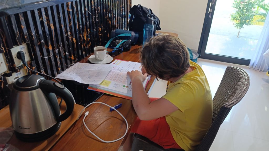 Cela étant, et d’autant plus avec son prochain passage au collège, il est important que le travail « scolaire » se poursuive durant ce voyage. Avant le départ, nous avons donc pu échanger avec son instituteur sur les apprentissages que la classe fera durant les mois d’absence de Maël, afin que nous puissions nous conformer au mieux au programme officiel.